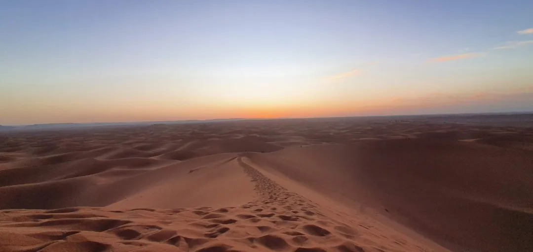 During the ascent, I think I stopped about ten times, between burning calves and shortness of breath. I told Bazou and my husband to go ahead of me and I even crawled on my knees and moved several meters on all fours, to reach the top. I got there just a few minutes before sunset and the view that opened up before my eyes was worth every drop of sweat and effort: an endless expanse of orange dunes of impalpable sand, illuminated by the warm light of the setting sun.